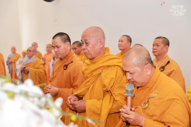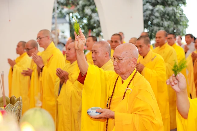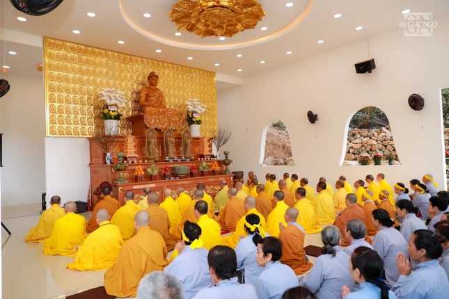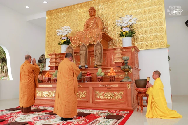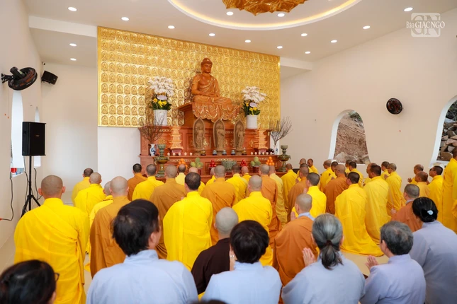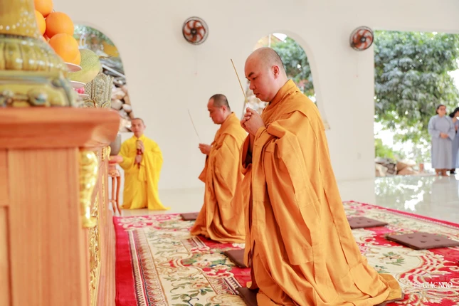 Tại chánh điện, chư tôn giáo phẩm đã niêm hương bạch Phật, sái tịnh đạo tràng trong sự nhất tâm cầu nguyện của đại chúng. Sau đó, chư tôn đức cùng đạo tràng Phật tử đồng tụng kinh Phổ Hiền và cử hành nghi thức cúng ngọ.