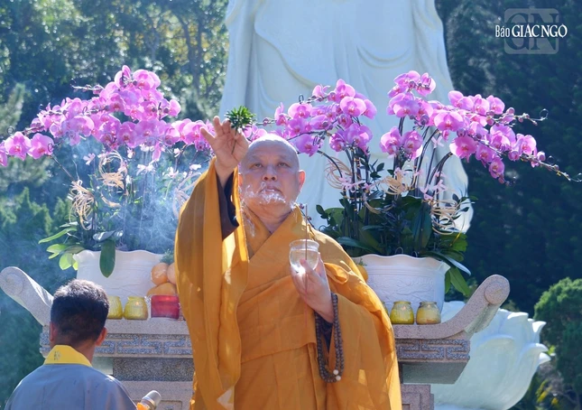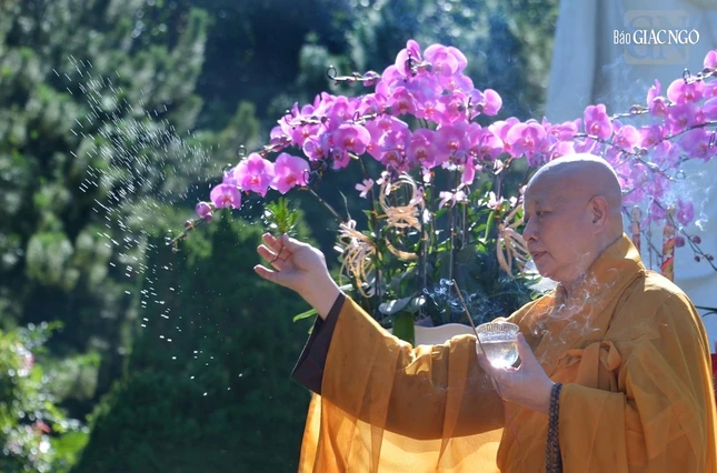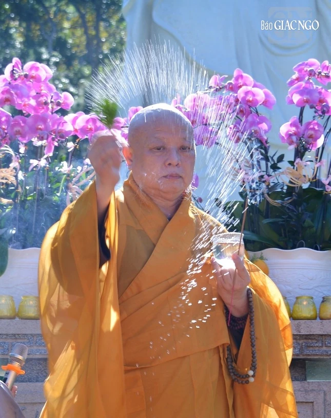 Hòa thượng Thích Lệ Trang sái tịnh và xưng tán hồng danh cung thỉnh Pháp thân Đức Phật A Di Đà an vị theo nghi thức truyền thống với sự hộ niệm, cầu nguyện của bốn chúng hiện diện.