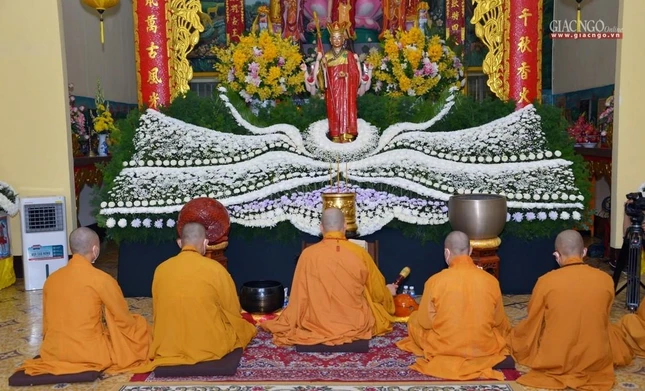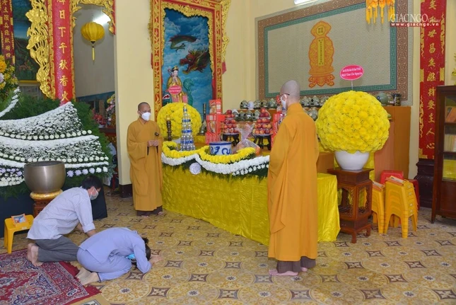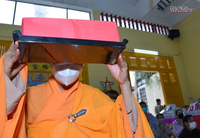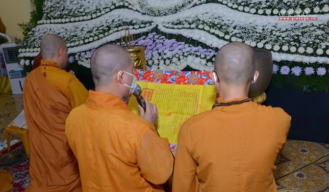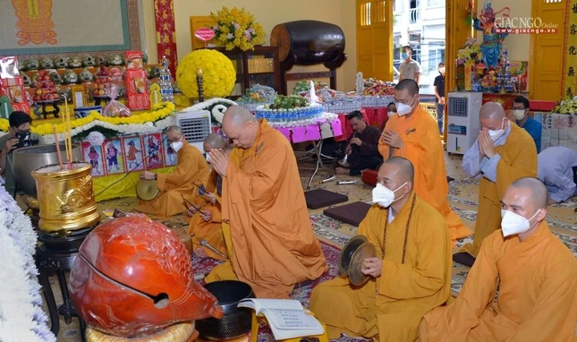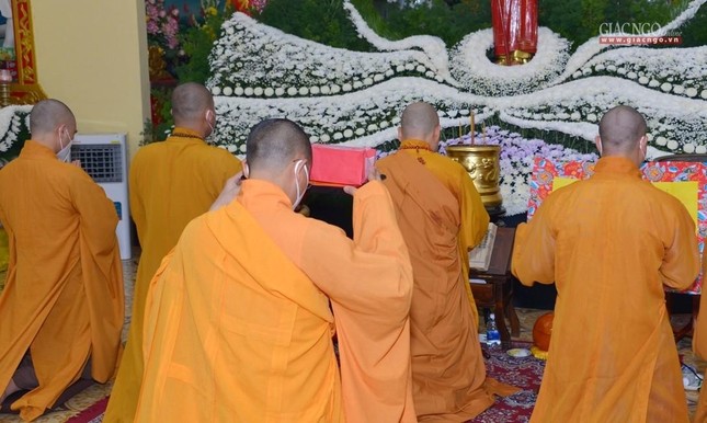 Theo đó, chư Tăng đã trang nghiêm cử hành nghi lễ theo truyền thống miền Bắc, Thượng tọa Thích Thanh Phong, Phó ban Trị sự kiêm Trưởng ban Từ thiện - Xã hội GHPGVN TP.HCM làm sám chủ, cùng chư Tăng Ban kinh sư chùa Vĩnh Nghiêm (quận 3) thực hiện.