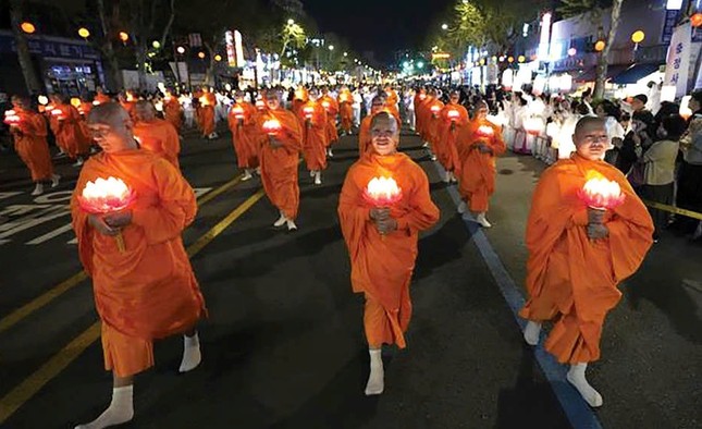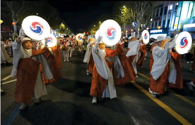 Dòng người rộn ràng, trong đó nhiều người khoác lên mình những bộ hanbok truyền thống, đã tạo nên một khung cảnh lung linh sắc màu khi cùng nhau rước những chiếc lồng đèn hình hoa sen rực rỡ đi qua các tuyến phố chính của thành phố.