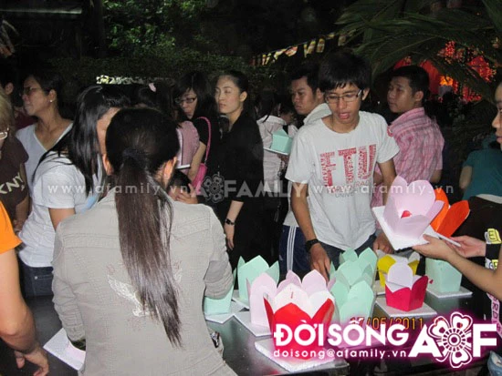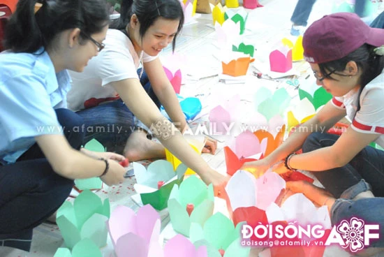 Một số bạn trẻ đang lo công việc hậu cần cho đêm hội, đó là xếp đèn - gắn nến – phân phát cho phật tử xa gần. Nhiều người chen chúc nhau chỉ mong “xin” được tí lộc nhà chùa.