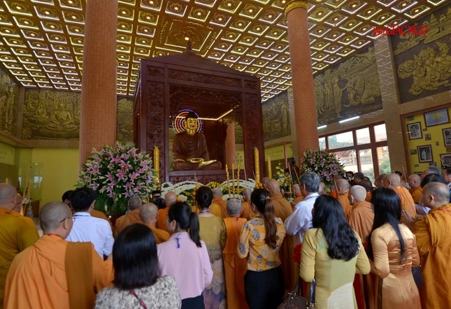 Chư tôn đức và quan khách niêm hương tại chánh điện trong lễ khánh thành Di tích đắc đạo Tổ sư Minh Đăng Quang tại Mũi Nai - Hà Tiên, tỉnh Kiên Giang - Ảnh: BGN