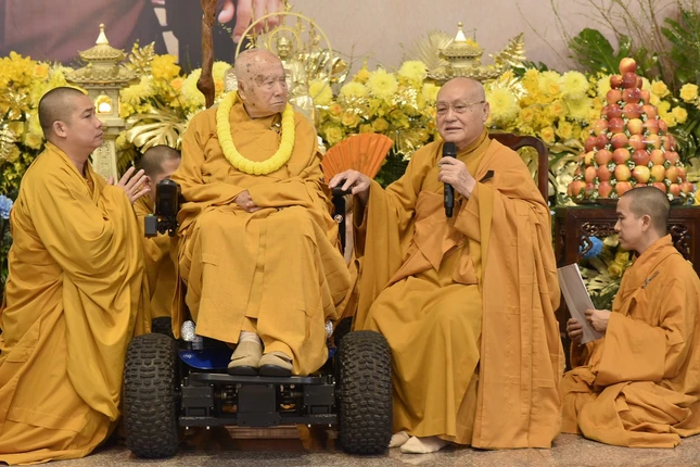 Trong niềm hiếu kính với bậc thầy đã khai sinh huệ mạng của mình, môn đồ đệ tử của Thiền sư đã thực hiện nghi thức dâng hoa, dâng trà kính mừng khánh tuế Đức Trưởng lão Hòa thượng tròn 100 tuổi.