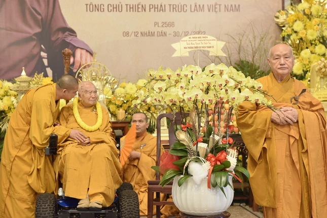 Hòa thượng Thích Nhật Quang thay mặt Ban Quản trị Thiền phái Trúc Lâm đón nhận lẵng hoa chúc mừng của Chủ tịch nước Nguyễn Xuân Phúc |