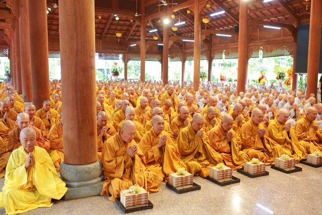 Sau 3 hồi chuông, trống Bát-nhã, hàng nghìn Tăng Ni, Phật tử đã trang nghiêm cung đón Đức Trưởng lão Hòa thượng Thích Thanh Từ quang lâm Thính pháp đường.
