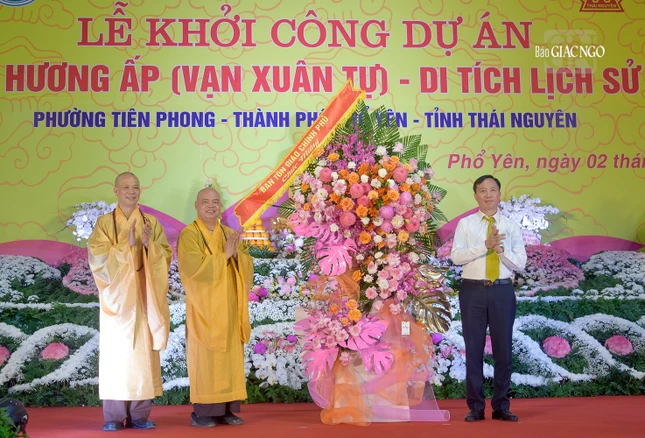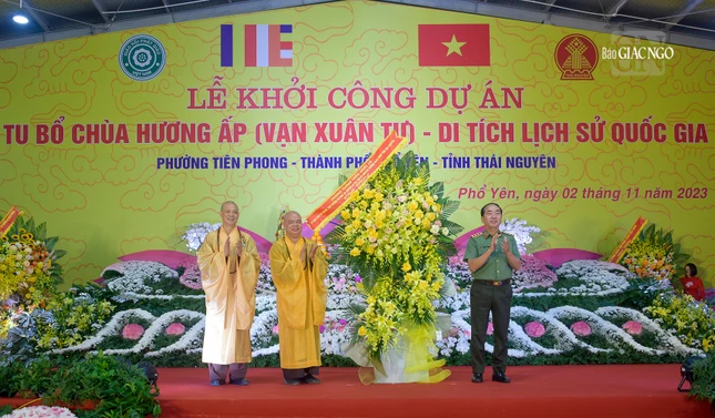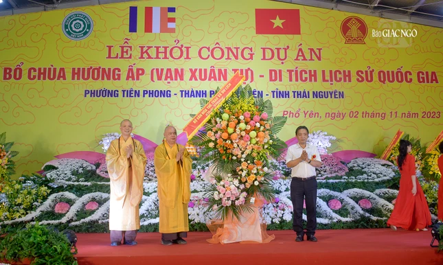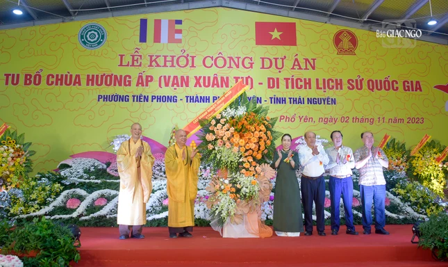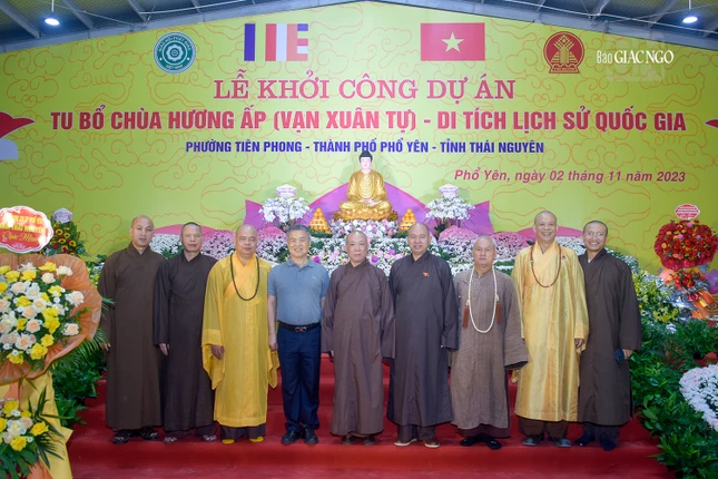 GNO - Sáng nay, 2-11, nhằm ngày vía Đức Bồ-tát Quán Thế Âm (19-9 ÂL), hơn 3.000 Tăng Ni, Phật tử, doanh nhân đã về Thái Nguyên tham dự lễ khởi công "Dự án tu bổ chùa Hương Ấp (Vạn Xuân tự) thuộc Khu di tích Lý Nam Đế" (P.Tiên Phong, TP.Phổ Yên, tỉnh Thái Nguyên).