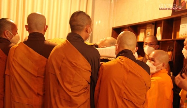 Hòa thượng Thích Quang Nhuận cung kính khải bạch trước lúc các pháp tử của Thiền sư cung thỉnh huyễn thân của ngài rời thiền thất Lắng Nghe, hướng về thiền đường Trăng Rằm - nơi tôn trí kim quan của ngài.
