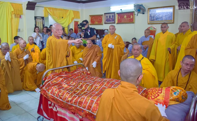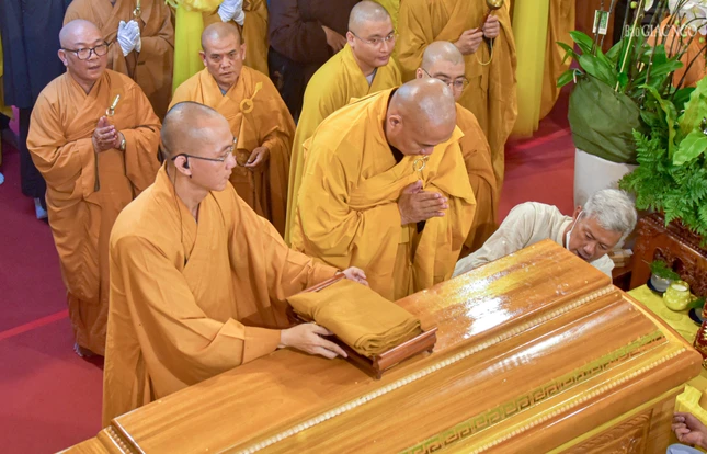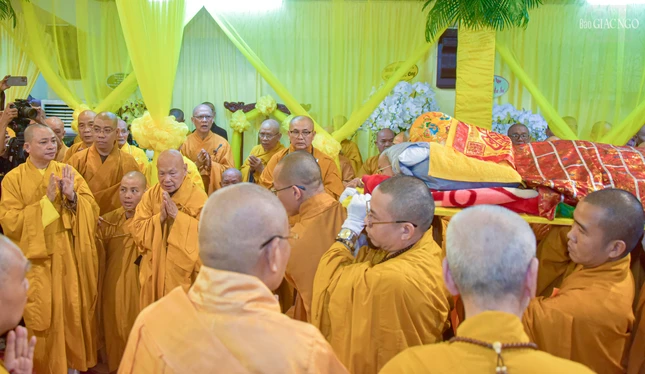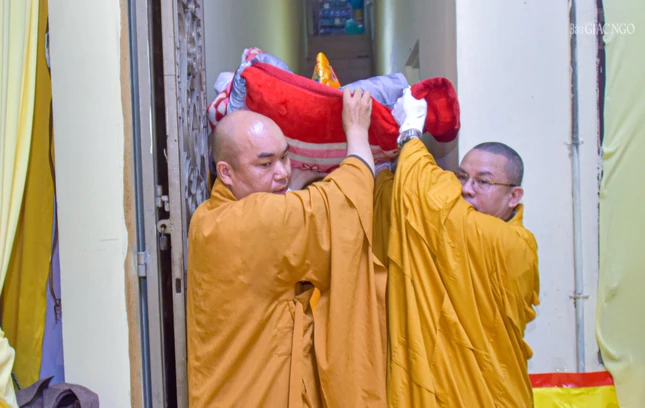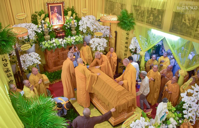 Trong tiếng niệm Phật nhất tâm của chư Tăng Ni và Phật tử, môn đồ pháp quyến đã cung thỉnh thân tứ đại của Trưởng lão Hòa thượng từ phương trượng đến Giác linh đường nhập kim quan.