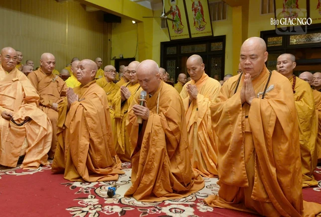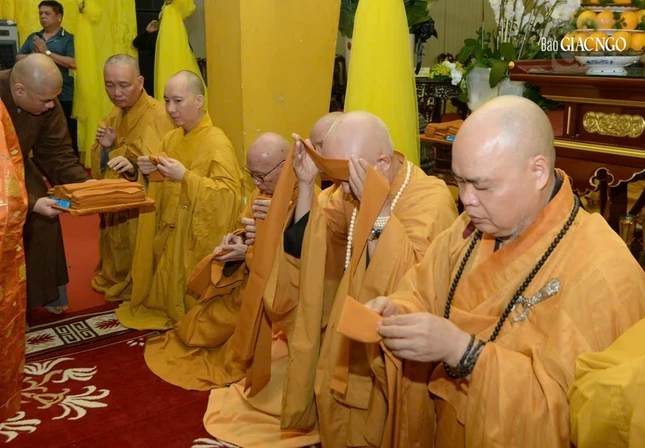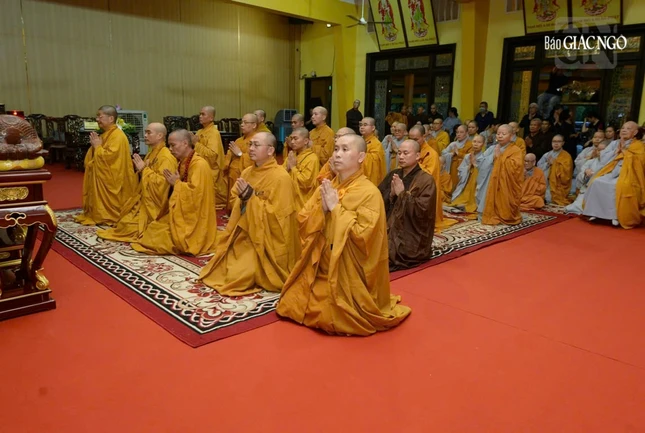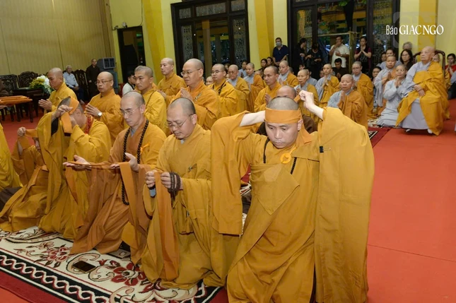 Tiếp đó, Hòa thượng Sám chủ cùng chư tôn đức Ban Kinh sư cử hành khóa lễ thỉnh giác linh Trưởng lão Hòa thượng an vị, môn đồ pháp quyến thọ tang Ân sư theo truyền thống thiền môn.
