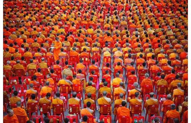 Hàng ngàn nhà sư đi qua những tín đồ trong nghi lễ tổ chức tại một trung tâm mua sắm Bangkok, Thái Lan. Các nhà tổ chức cho rằng 12.600 nhà sư đã tham gia lễ hội này.