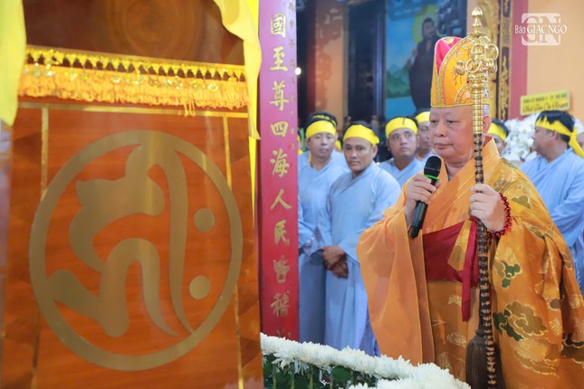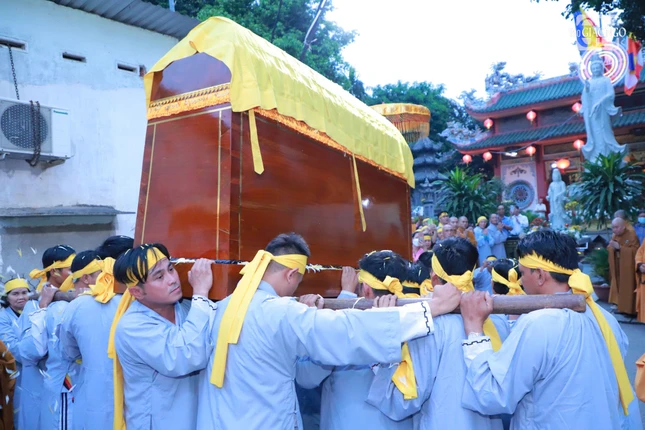 Hòa thượng Thích Lệ Trang, Trưởng ban Nghi lễ T.Ư, Trưởng ban Trị sự GHPGVN TP.HCM cử hành nghi lễ phất trần, cung tuyên pháp ngữ và thực hiện nghi thức di quan; môn đồ pháp quyến cung thỉnh bát hương, long vị, y bát, di ảnh, kim quan Hòa thượng rời Giác linh đường đến Đài hỏa táng Hoa viên Sala Garden (H.Long Thành, Đồng Nai) để trà-tỳ.