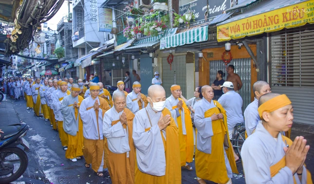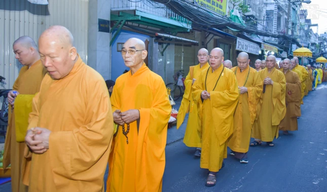 | Môn đồ đệ tử cung thỉnh bát hương, y bát, long vị, di ảnh cố Ni trưởng rời Giác linh đường |