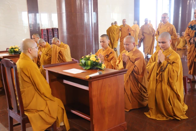 Tiếp theo, dưới sự hướng dẫn của chư tôn đức, gần 400 hành giả Tăng tuần tự 3 vị đã tác pháp Tự tứ với chư tôn đức Hội đồng Điều hành và Ban Quản viện.