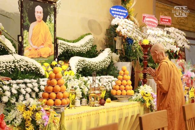 Trước di ảnh Hòa thượng Thích Giác Nhiên tại giảng đường, chư tôn giáo phẩm đã dâng hương tưởng niệm, tri ân công đức cố Hòa thượng. Hòa thượng Thích Lệ Trang, Trưởng ban Trị sự GHPGVN TP.HCM xướng tụng Tứ hoằng thệ nguyện cùng đại chúng nhất tâm cầu nguyện Giác linh Hòa thượng cao đăng Phật quốc.
