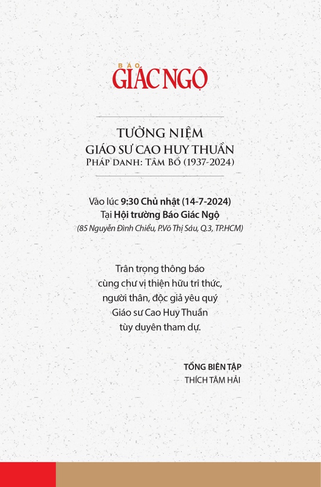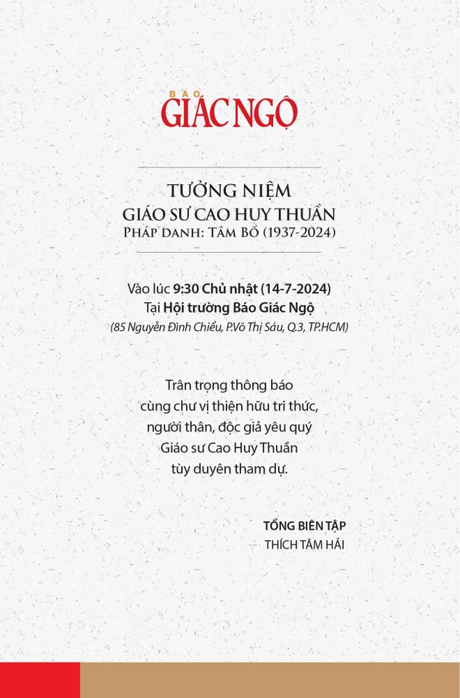 Ở TP.HCM, Báo Giác Ngộ sẽ tổ chức Lễ tưởng niệm Giáo sư Cao Huy Thuần vào lúc 9 giờ 30 Chủ nhật, ngày 14-7-2024 (nhằm mùng 9-6 Âm lịch) tại Hội trường Trụ sở tòa soạn, số 85 đường Nguyễn Đình Chiểu, P.Võ Thị Sáu, Q.3.