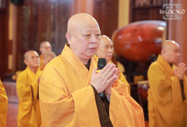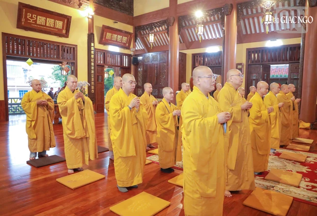 Tại chánh điện, Hòa thượng Thích Huệ Giải sám chủ, cùng Ban Kinh sư cử hành lễ cúng ngọ theo nghi lễ Phật giáo truyền thống kinh đô Phú Xuân.