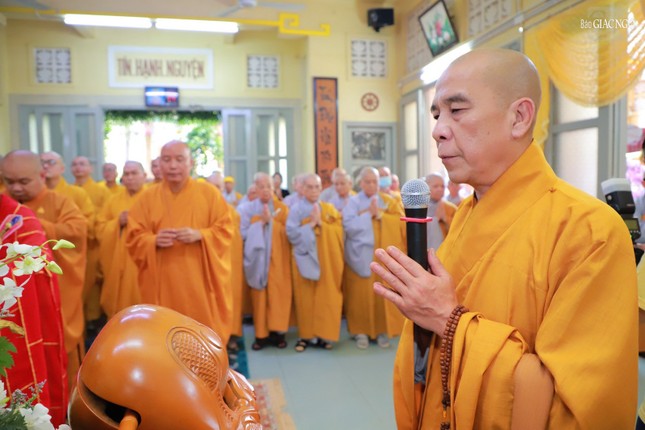 Trước Giác linh đường, chư tôn đức giáo phẩm Tăng Ni đã niêm hương tưởng niệm, Ban nghi lễ cung thỉnh Trưởng lão Hòa thượng Thích Như Tín, Ủy viên Thường trực Hội đồng Chứng minh cung tuyên pháp ngữ, phất trần.