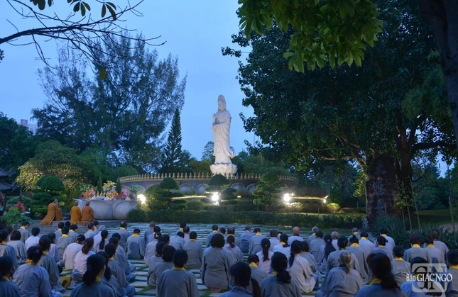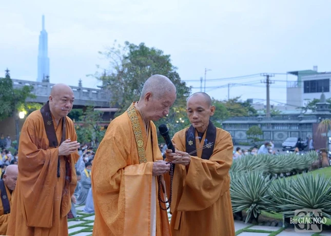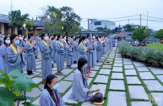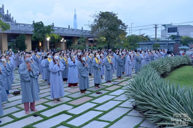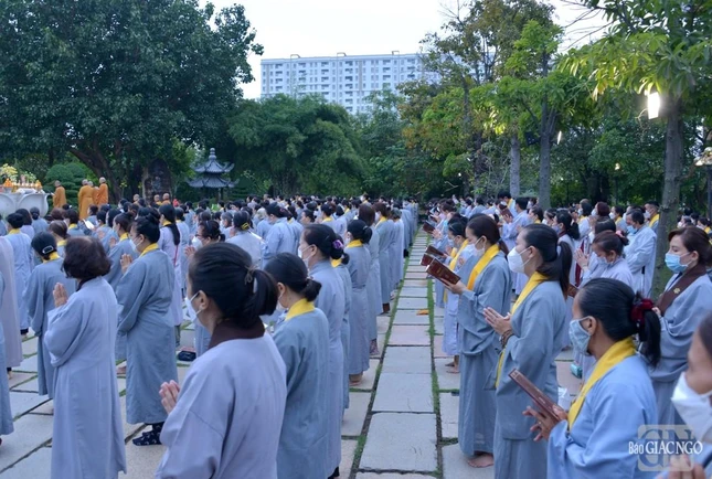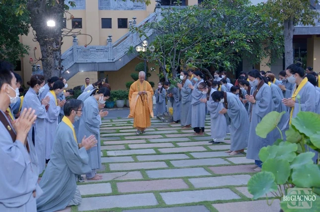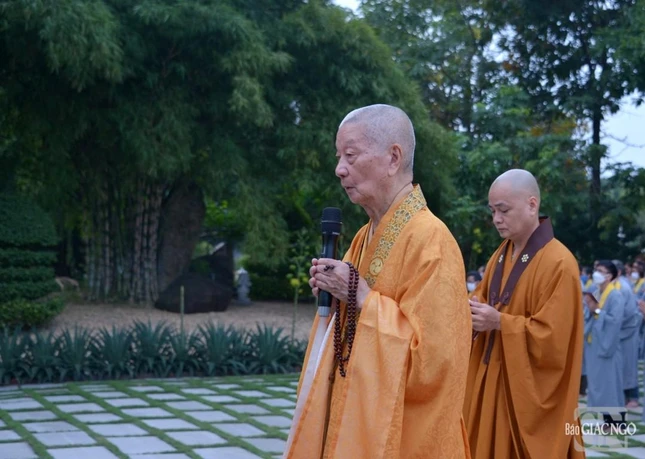 Chư Tăng hướng dẫn Phật tử trì tụng phẩm Phổ môn trong kinh Pháp hoa và đảnh lễ 12 lời nguyện của Bồ-tát, hồi hướng cầu nguyện an lành đến với tất cả.