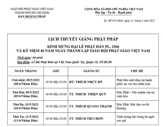 Theo đó, chư tôn đức Ban Hoằng pháp sẽ thuyết giảng từ ngày 8-5-2022 (8-4-Nhâm Dần) đến 15-5-2022 (15-4-Nhâm Dần), bắt đầu từ lúc 19 giờ đến 20 giờ.