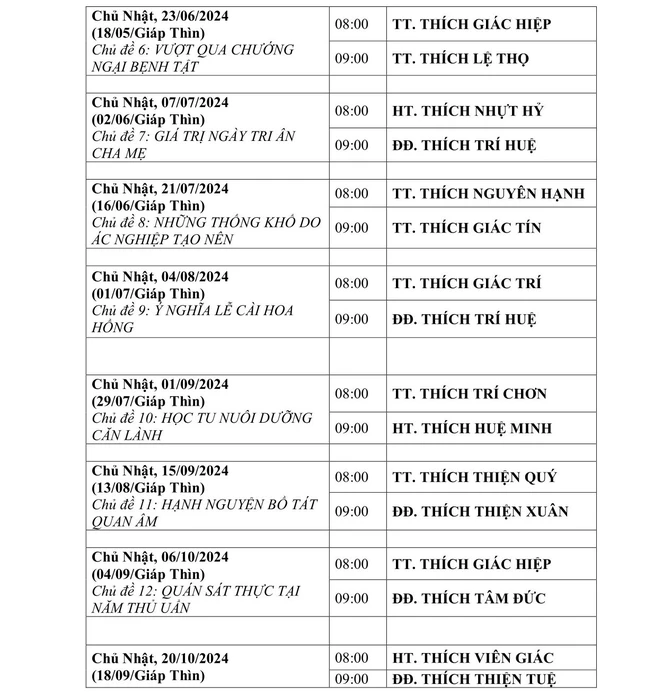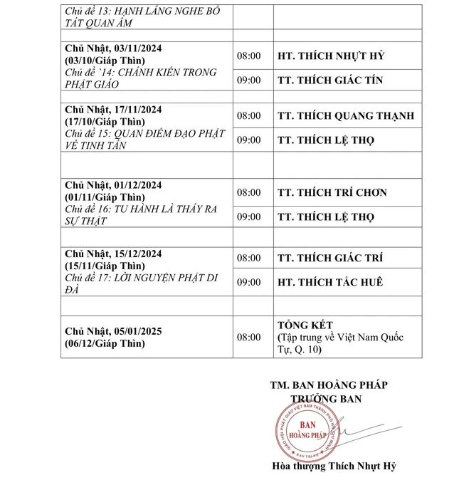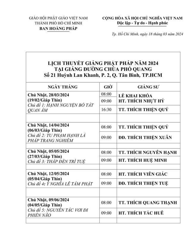 Theo đó, ngày 18-3-2024, Hòa thượng Thích Nhựt Hỷ, Phó ban Trị sự kiêm Trưởng ban Hoằng pháp GHPGVN TP.HCM đã ký thông tin phổ biến về Lịch thuyết giảng Phật pháp năm 2024 tại giảng đường chùa Phổ Quang (số 21 đường Huỳnh Lan Khanh, P.2, Q.Tân Bình, TP.HCM) với các chủ đề và các vị giảng sư như sau: