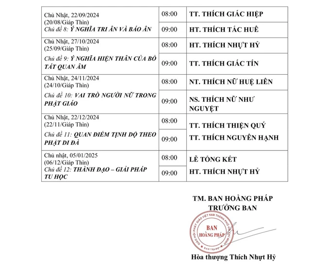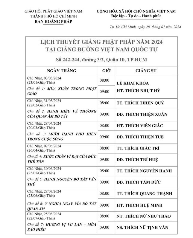 GNO - Hòa thượng Thích Nhựt Hỷ, Phó ban Trị sự kiêm Trưởng ban Hoằng pháp GHPGVN TP.HCM đã ký thông tin phổ biến về Lịch thuyết giảng Phật pháp trong năm 2024 tại Việt Nam Quốc Tự (số 242-244 đường 3/2, Q.10, TP.HCM).