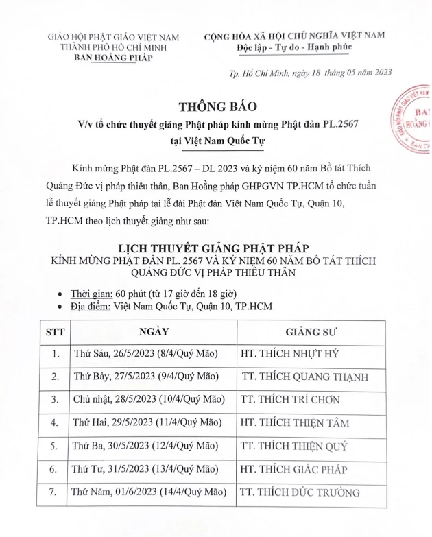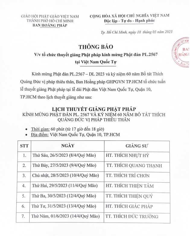 Theo đó, lịch thuyết giảng của chư tôn đức Ban Hoằng pháp GHPGVN TP.HCM trong Tuần Phật đản tại lễ đài chính của Phật giáo TP.HCM - Việt Nam Quốc Tự vào lúc 17 giờ đến 18 giờ, từ ngày 8-4-Quý Mão đến 14-4-Quý Mão, phục vụ Phật tử, đồng bào TP.HCM, theo lịch sau: