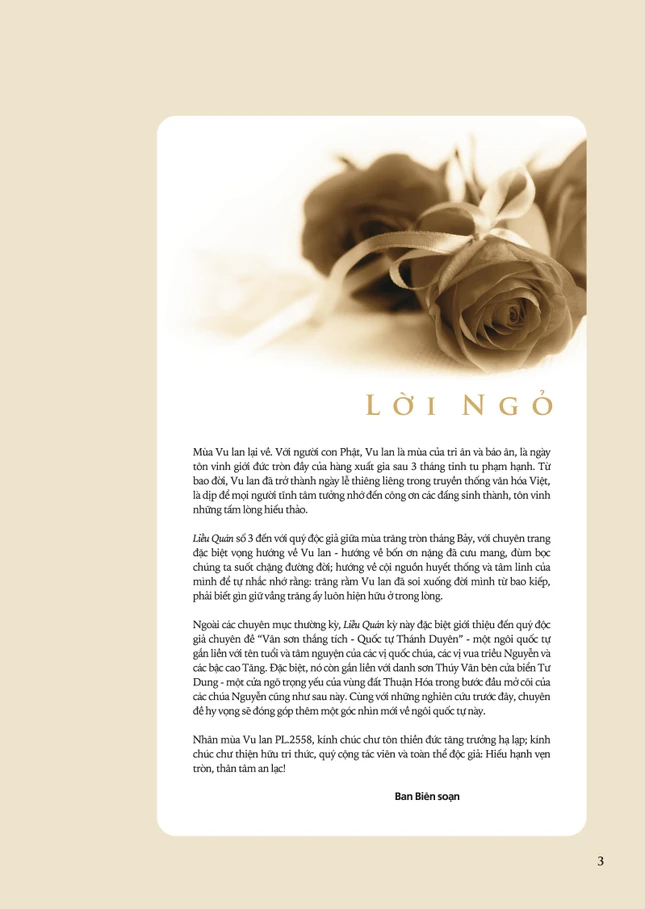 Ấn phẩm Liễu Quán số 3, đến với bạn đọc giữa mùa trăng tròn tháng Bảy, với chuyên trang đặc biệt hướng vọng về Vu lan ngoài ra còn giới thiệu với bạn đọc các chuyên mục thường kỳ, đặc biệt số này Liễu Quán giới thiệu đến bạn đọc chuyên đề "Vân sơn thắng tích-Quốc tự Thánh Duyên", một ngôi quốc tự gắn liền với tên tuổi của các vị vua, chúa nhà Nguyễn và các vị danh Tăng Thuận Hóa...