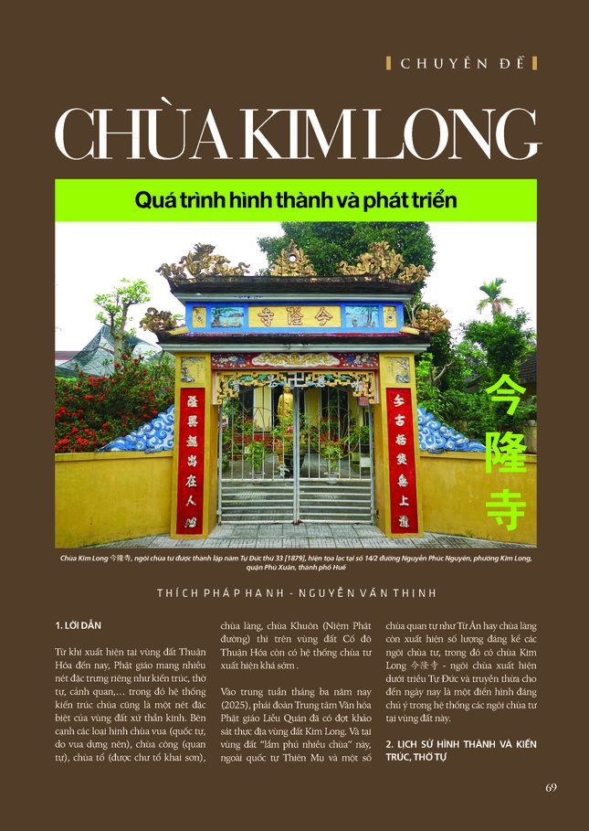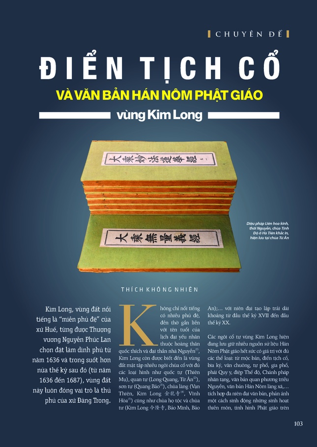 Các bài viết trong chuyên đề với giá trị nghiên cứu, học thuật cao đến từ các tên tuổi có uy tín trong lĩnh vực nghiên cứu lịch sử, văn hóa Cố đô như: Trần Đình Hằng, Trần Đại Vinh, Phạm Đức Thành Dũng, Nguyễn Phước Bảo Đàn, Võ Vinh Quang, Lê Thọ Quốc,… góp phần khơi dậy những câu chuyện liên quan đến lịch sử hình thành và phát triển của các ngôi chùa cổ vùng Kim Long phần nào khuất lấp dưới lớp bụi phủ thời gian.