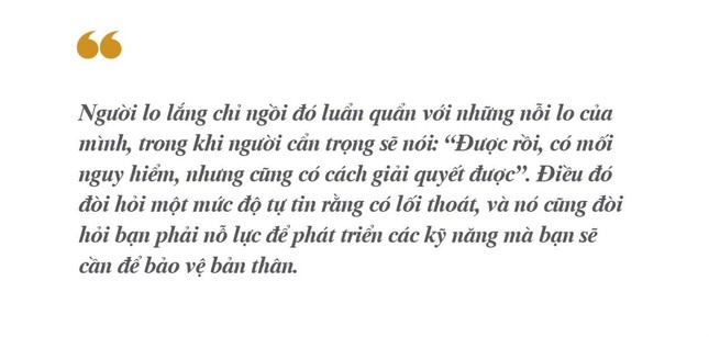 Đức Phật dạy chúng ta không phản ứng bằng cách giả vờ rằng những nguy hiểm này không có thật, mà là chuẩn bị để đón nhận chúng một cách khôn ngoan. Đó là sự khác biệt giữa lo lắng và sự cẩn trọng. Người lo lắng chỉ ngồi đó luẩn quẩn với những nỗi lo của mình, trong khi người cẩn trọng sẽ nói: “Được rồi, có mối nguy hiểm, nhưng cũng có cách giải quyết được”. Điều đó đòi hỏi một mức độ tự tin rằng có lối thoát, và nó cũng đòi hỏi bạn phải nỗ lực để phát triển các kỹ năng mà bạn sẽ cần để bảo vệ bản thân.