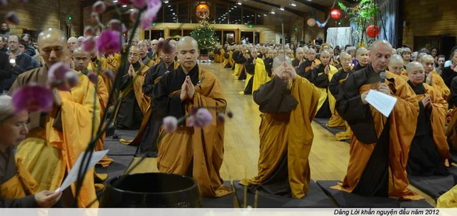 Lạy Mẹ, trong giờ phút bước sang Năm Mới 2012, chúng con kính cẩn phát nguyện là chúng con sẽ tập sống thật hài hòa và an vui trong phạm vi gia đình và tăng thân của chúng con, như những con ong cùng sống chung trong một tổ ong hay những tế bào của cùng một cơ thể. Chúng con hứa sẽ học hỏi thái độ cởi mở để có thể truyền thông được dễ dàng với những thành phần khác trong gia đình và trong tăng thân chúng con. Chúng con hứa sẽ luôn tập hạnh lắng nghe và nói lời hòa ái. Chúng con nguyện tập lắng nghe tiếng nói của Mẹ, để có thể hiểu Mẹ sâu sắc hơn và để có thể tiếp nhận lời chỉ dạy của Mẹ cũng như của tổ tiên chúng con. Chúng con sẽ tập lắng nghe anh chị em, bằng hữu và con cháu của chúng con để chúng con có thể sống hài hòa và hạnh phúc với nhau. Chúng con nguyện sẽ tập thấy hạnh phúc của gia đình và tăng thân là hạnh phúc của chính mình.
