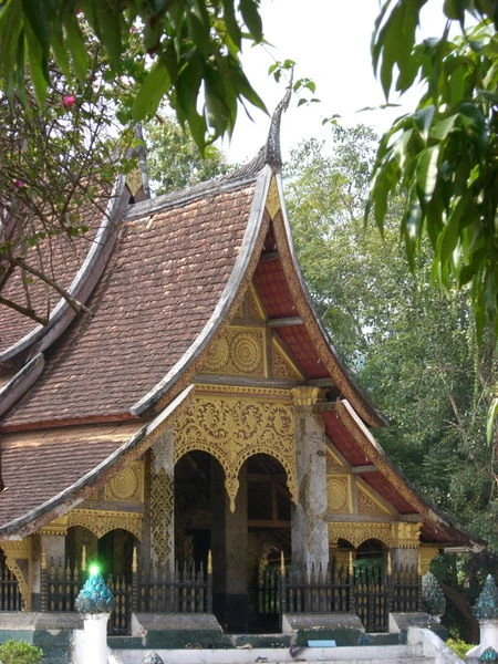Có lẽ những gì tinh hoa nhất của kiến trúc Lào được thể hiện ở ngôi chùa Wat Xieng Thoong, được xây dựng vào cuối thế kỷ thứ 16 – ngôi chùa được Unesco công nhận là di sản văn hóa thế giới năm 1995, một nét đẹp kiến trúc đến nao lòng. Không đồ sộ, nguy nga…chùa Wat Xieng thoong (có nghĩa là Thành Phố Vàng) với những lớp mái cong mềm mại, tinh tế và khiêm nhường in trên nền trời Luang Prabang xanh vời vợi. Họa tiết, phù điêu, cửa chùa được điêu khắc và trang trí bằng vàng, bạc, tường phía sau là bức tranh mozaic ghép bằng đá và thủy tinh lấp lánh một cách mê hoặc dưới ánh nắng mặt trời…. du khách tới đây không khỏi sững sờ bởi nghệ nhân Lào đã tạo ra nét tinh xảo đến tuyệt mỹ.