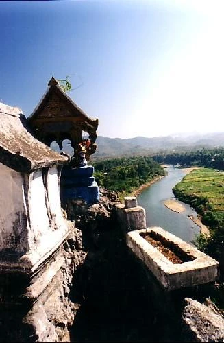 Một địa danh nữa không thể không nhắc tới ở Luang Prabang, chính là núi Phousi – trên đỉnh núi ngắm hoàng hôn có lẽ thú vị nhất ở Lào. Dưới hương hoa chăm - pa thoang thoảng, bên cạnh những cành phượng vĩ, du khách ngồi san sát, ai ai cũng cầm ống kính để ghi lại khoảnh khắc mặt trời từ từ buông giọt nắng cuối cùng dưới rặng “núi Chàng, núi Nàng” xa xa.