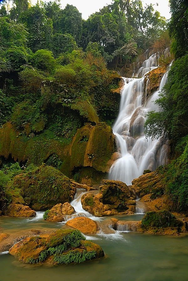 Không chỉ có những công trình kiến trúc tinh hoa cổ kính, Luang Prabang còn nằm cạnh một thác nước trong xanh như ngọc – thác Kuang Si nằm cách trung tâm chỉ 29 km. Thác đã tạo ra rất nhiều tầng bể bơi tự nhiên trong vắt bên những cây cổ thụ có lẽ hàng trăm năm tuổi. Du khách thích thú vui vầy dưới nước giữa thiên nhiên vẫn còn hoang sơ.