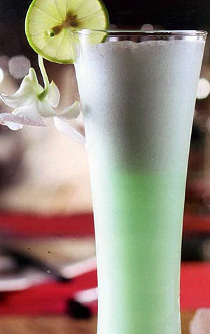Cho tất cả các thành phần vào máy sinh tố, xay đều. Rót ra ly cao, trang trí lát chanh vào hoa lan, dùng lạnh.