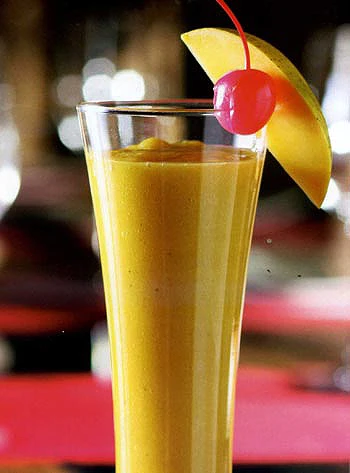 1/2 quả xoài, 1 quả chuối, 45ml nước ép thơm, đá bào.