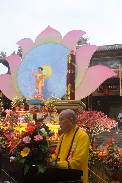 Hòa thượng Thích Khế Chơn Phó Ban Tổ chức Đại lễ Phật đản PL.2555, Trưởng Ban Xe hoa điều hành chương trình diễu hành xe hoa, nói lên ý nghĩa việc thiết trí xe hoa cúng dường đức Phật đản sanh và thông báo lộ trình mà đoàn xe hoa sẽ đi qua.