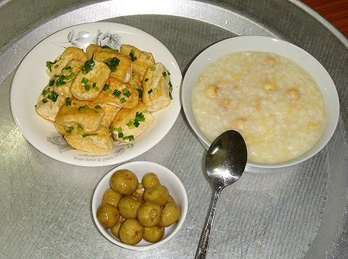 Cháo: gạo tẻ, 1 chút gạo nếp, đậu xanh hoặc đậu đen. Mình cho thêm ít hạt sen cho dễ ngủ.