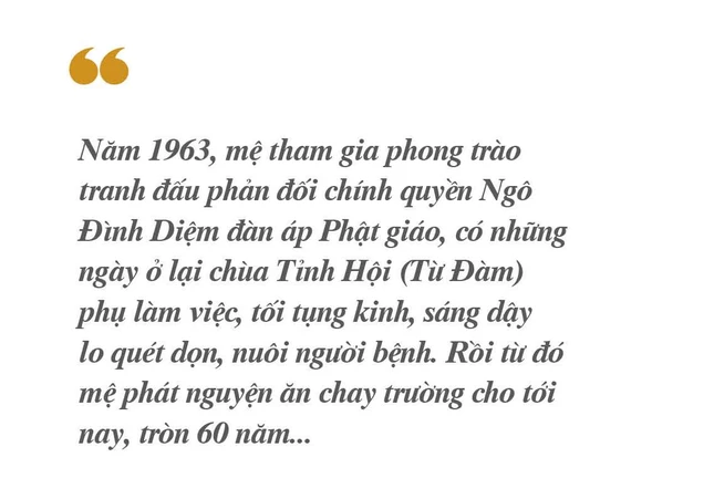 Năm 1963, mệ tham gia phong trào tranh đấu phản đối chính quyền Ngô Đình Diệm đàn áp Phật giáo, có những ngày ở lại chùa Tỉnh Hội (Từ Đàm) phụ làm việc, tối tụng kinh, sáng dậy lo quét dọn, nuôi người bệnh. Mệ nhớ lại: “Hồi đó không thấy vất vả, không mệt. Cái tâm mình cứ rứa mà làm, không buồn, cũng không vui không có chi hết. Cái đó là từ nhỏ nó vậy”. Rồi từ đó mệ phát nguyện ăn chay trường cho tới nay, đã 60 năm để cầu cho Phật giáo trường tồn và cho những đạo hữu của mình được khỏe mạnh.