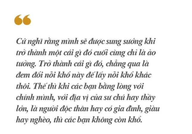 Cứ nghĩ rằng mình sẽ được sung sướng khi trở thành một cái gì đó cuối cùng chỉ là ảo tưởng. Trở thành cái gì đó, chẳng qua là đem đổi nỗi khổ này đế lấy nỗi khổ khác thôi. Thế thì khi các bạn bằng lòng với chính mình, với địa vị của sư chú hay thầy lớn, là người độc thân hay có gia đình, giàu hay nghèo, thì các bạn không còn khổ.