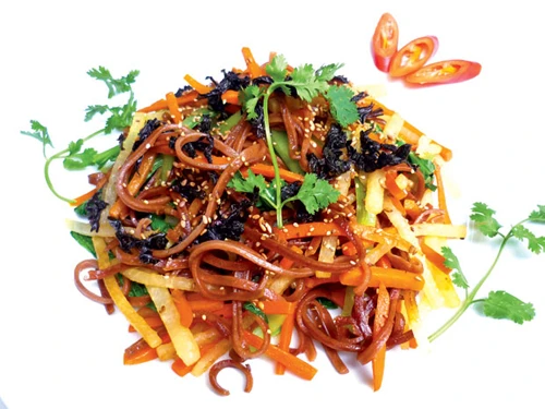 Cách làm: Củ sắn, càrốt bào vỏ, xắt sợi. Cải thìa cắt khúc để cọng, lá riêng. Hủ tíu ngâm 30 phút cho mềm. Phi hành poarô với dầu cho thơm, cho củ sắn, càrốt vào xào khoảng ba phút, cho cải thìa cọng vào. Cho hủ tíu vào xào, nêm tương tamary, gia vị cho vừa ăn, cho lá cải thìa vào xào sơ. Trang trí món ăn với mè rang vàng và rong biển rang tương.