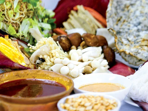 Ăn kèm với thịt heo quay chay, đậu hũ, chả cá chay, bắp chuối bào, cải caron xắt sợi, húng lũi, bún tươi, các loại nấm, đậu phộng rang và bánh tráng nướng.