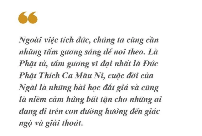 Ngoài việc tích đức, chúng ta cũng cần những tấm gương sáng để noi theo. Là Phật tử, tấm gương vĩ đại nhất là Đức Phật Thích Ca Mâu Ni, cuộc đời của Ngài là những bài học đắt giá và cũng là niềm cảm hứng bất tận cho những ai đang đi trên con đường hướng đến giác ngộ và giải thoát, những công hạnh và lời dạy của Ngài luôn là kim chỉ nam đối với tất cả chúng ta.