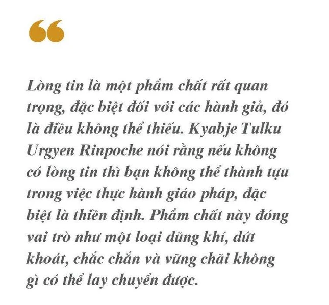 Lòng tin là một phẩm chất rất quan trọng, đặc biệt đối với các hành giả, đó là điều không thể thiếu. Kyabje Tulku Urgyen Rinpoche nói rằng nếu không có lòng tin thì bạn không thể thành tựu trong việc thực hành giáo pháp, đặc biệt là thiền định. Phẩm chất này đóng vai trò như một loại dũng khí, dứt khoát, chắc chắn và vững chãi không gì có thể lay chuyển được. Đó không phải là một trạng thái tâm lý run rẩy hay do dự, kiểu suy nghĩ như “Ồ, tôi không chắc liệu thiền có thực sự mang lại lợi ích hay không. Thiền có phù hợp với tôi hay không?...”, và chúng ta sẽ không thể đạt được bất kỳ điều gì nếu cứ mãi nghi ngờ như thế.