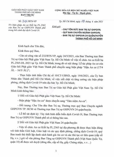 Theo đó, căn cứ công văn số 232/BTS-VP, ngày 24-5-2021, của Ban Thường trực Ban Trị sự GHPGVN TP.HCM về việc tổ chức An cư kiết hạ Phật lịch 2565 – Dương lịch 2021 tại TP.HCM; trong đó có nội dung về lễ tác pháp an cư của GHPGVN Thành phố chuyển sang biện pháp “Hậu An cư (17-4 Âm lịch – 16-5 Âm lịch)”; Thực hiện tinh thần Chỉ thị số 10/CT-UBND, ngày 19-6-2021 của Ủy ban Nhân dân TP.HCM về việc siết chặt và tăng cường các biện pháp phòng, chống dịch Covid-19 trên địa bàn TP.HCM, Ban Thường trực Ban Trị sự GHPGVN TP.HCM thông báo: