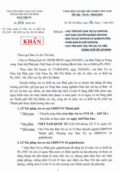 Công văn số 232/BTS-VP của Ban Thường trực Ban Trị sự GHPGVN TP.HCM gửi đến chư tôn đức Ban Trị sự GHPGVN, các ban chuyên môn thuộc GHPGVN, Ban Trị sự GHPGVN 24 quận huyện, Phân ban Ni giới GHPGVN, chư tôn đức trụ trì các tự viện.