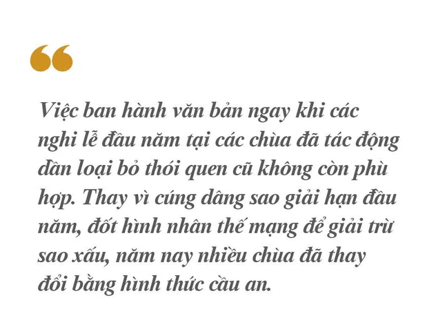Việc ban hành văn bản ngay khi các nghi lễ đầu năm tại các chùa đã tác động dần loại bỏ thói quen cũ không còn phù hợp. Thay vì cúng dâng sao giải hạn đầu năm, đốt hình nhân thế mạng để giải trừ sao xấu, năm nay nhiều chùa đã thay đổi bằng hình thức cầu an. Ghi nhận tại chùa Trấn Quốc (quận Tây Hồ), năm nay nhà chùa thực hiện làm lễ cầu an cho người dân vào ngày 30-1 (tức mùng 9 tháng Giêng), không thực hiện cúng dâng sao giải hạn, đốt vàng mã. Tại chùa Quán Sứ (quận Hoàn Kiếm), một bảng thông báo nêu rõ, lễ cầu an, cầu tài lộc đầu năm được tổ chức vào 18g30 các ngày 6, 9, 13, 18 tháng Giêng âm lịch.