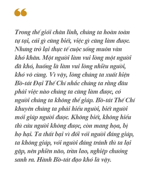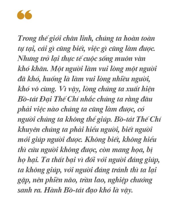 Trong thế giới chân linh, chúng ta hoàn toàn tự tại, cái gì cũng biết, việc gì cũng làm được. Nhưng trở lại thực tế cuộc sống muôn vàn khó khăn. Một người làm vui lòng một người đã khó, huống là làm vui lòng nhiều người, khó vô cùng. Vì vậy, lòng chúng ta xuất hiện Bồ-tát Đại Thế Chí nhắc chúng ta rằng đâu phải việc nào chúng ta cũng làm được, có người chúng ta không thể giúp. Bồ-tát Thế Chí khuyên chúng ta phải hiểu người, biết người mới giúp người được. Không biết, không hiểu thì cứu người không được, còn mang họa, bị họ hại. Ta thất bại vì đối với người đáng giúp, ta không giúp, với người đáng tránh thì ta lại gặp, nên phiền não, trần lao, nghiệp chướng sanh ra. Hành Bồ-tát đạo khó là vậy.