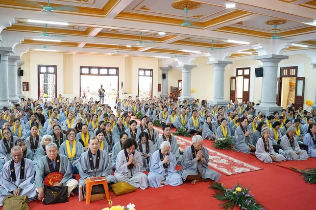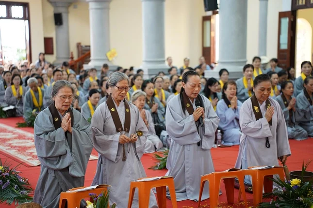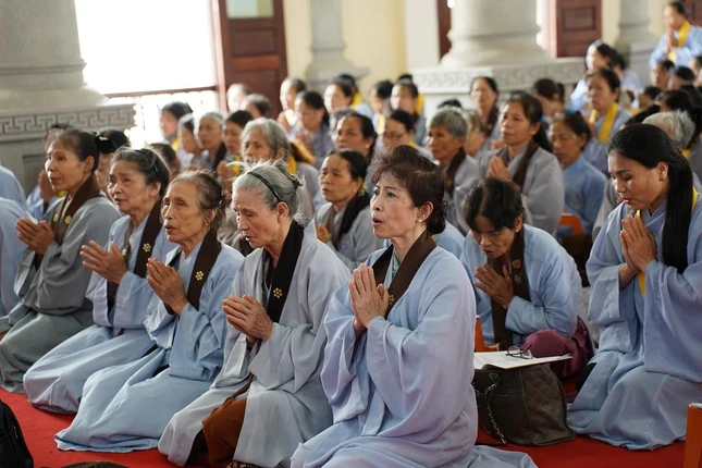 Vào đầu giờ chiều, đại chúng tiếp tục bước vào khóa lễ tụng kinh Phổ môn trong sự trang nghiêm, thành kính. Sau đó, đại chúng cung đón Hòa thượng Thích Quảng Hà, Phó Chủ tịch Hội đồng Trị sự, Trưởng ban Trị sự GHPGVN tỉnh Nam Định quang lâm sách tấn các Phật tử tham dự khóa tu.