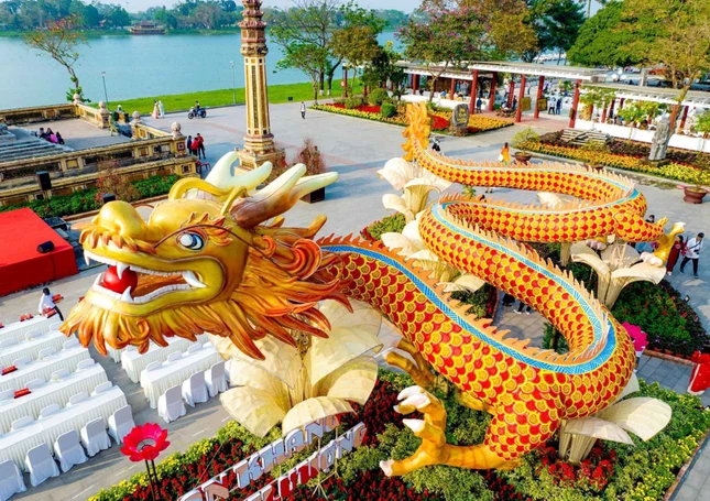 Được biết, linh vật rồng Tết Giáp Thìn 2024 tại TP.Huế lấy ý tưởng từ rồng thời nhà Nguyễn, có chiều cao 7m và chiều dài 35m, được đặt tại không gian phía trước cổng Trường Quốc học Huế, bia Quốc học cạnh bờ sông Hương và đường Lê Lợi. Cặp linh vật rồng này có nét uyển chuyển nhưng vẫn giữ sự uy nghi vốn có.