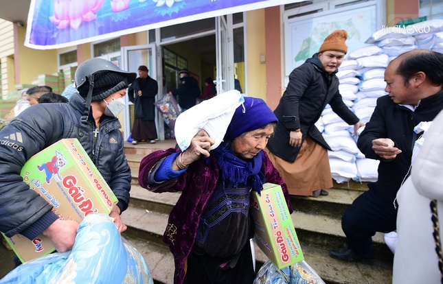 Theo đó, Thượng tọa Thích Thanh Phong, Phó Chủ tịch Hội đồng Trị sự, Phó Trưởng ban Trị sự kiêm Trưởng ban Từ thiện - Xã hội Phật giáo TP.HCM đã hướng dẫn Tăng Ni, Phật tử trong đoàn trao tặng các phần quà đầu tiên đến người dân tại Lào Cai và Lai Châu.